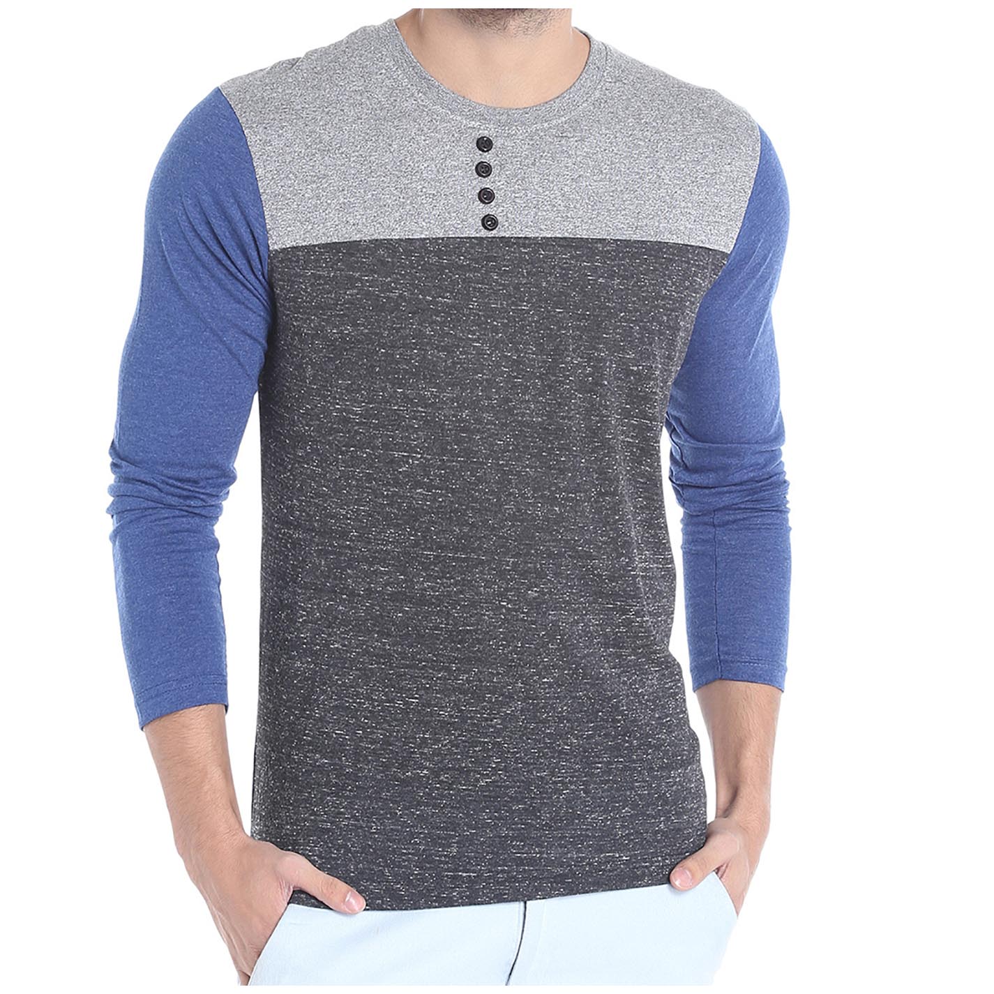 Grey and blue colour blocked T-shirt, has a round neck with buttoned detail beneath, long sleeves cotton machine washable.